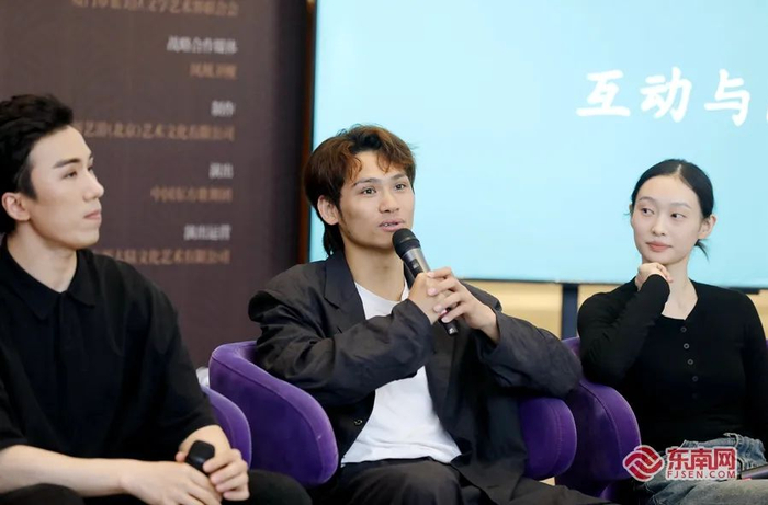 中国东方演艺集团编导、舞剧《海的一半》总编导、编舞林辰(中)分享创作经验。