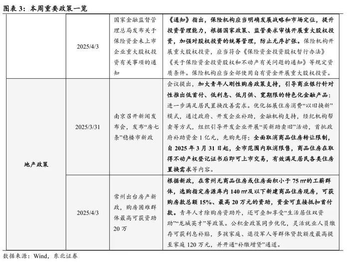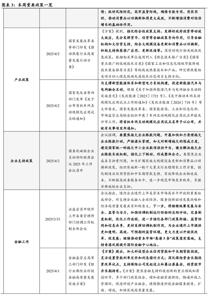 本周披露PMI数据:3月制造业PMI指数为50.5%,环比上行0.3个百分点,整体符合预期。3月工作日充足,中旬以来企业复工复产基本到位,开工率持续修复,叠加政策环境宽松,供需两端协同增长,春旺特征较为明显。非制造业PMI指数为50.8%,较上月继续回升0.4个百分点,建筑业、服务业景气度均有所回升。3月PMI释放积极信号的同时,也需注意到价格未见明显改善及中小企业景气度不足的不均衡修复问题,尤其后续特朗普关税逐步落地外需扰动或加大,稳内需稳就业巩固经济复苏势头至关重要。