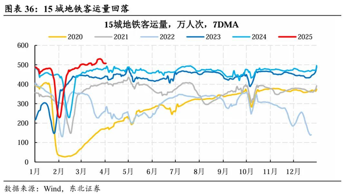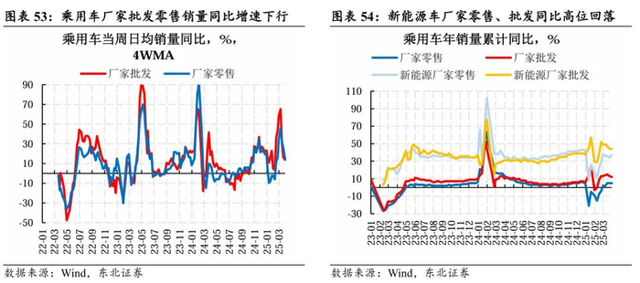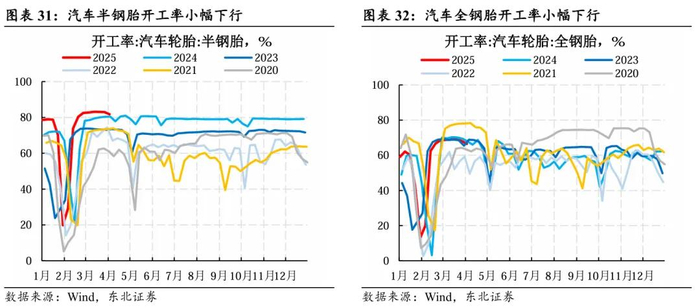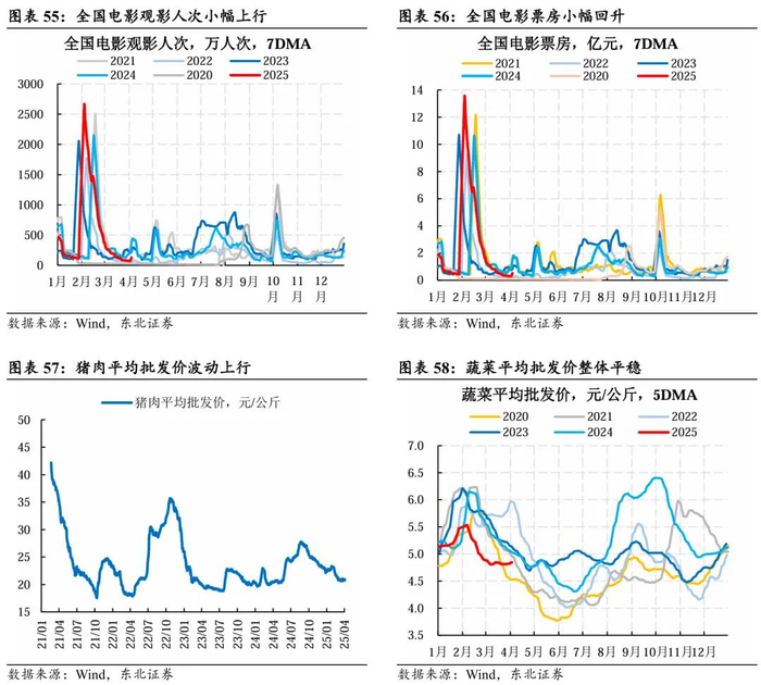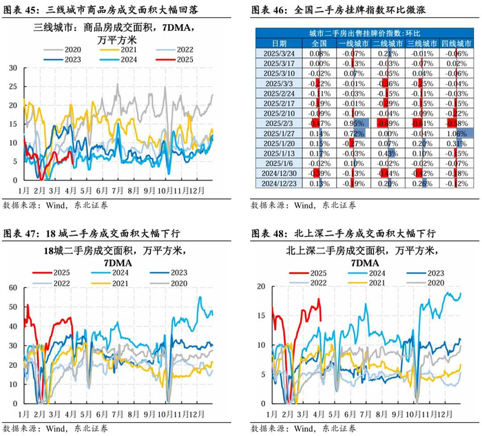 3) 地产成交量下行,但二手房价出现止跌回稳迹象,土地成交溢价率再创年内新高。主要在季节性等因素影响下,本周30大中城市商品房成交面积有所回落,分能级来看一线城市销售面积处于季节性均值水平,三线城市处于季节性下沿。二手房交易方面,18城二手房成交面积大幅下行,北上深二手房销售面积同样出现大幅下行。但值得关注的是房地产市场亦出现了一些积极表现:一方面,全国二手房挂牌价指数微涨0.08%,房价出现止跌回稳迹象;另一方面,3月末百城成交土地溢价率攀升至23.12%,创下年内新高。当前地产市场各项数据表现分化,或指向地产需求回升趋势仍不稳固,关注外需冲击下后续各地地产优化政策进一步大幅加码的可能性。