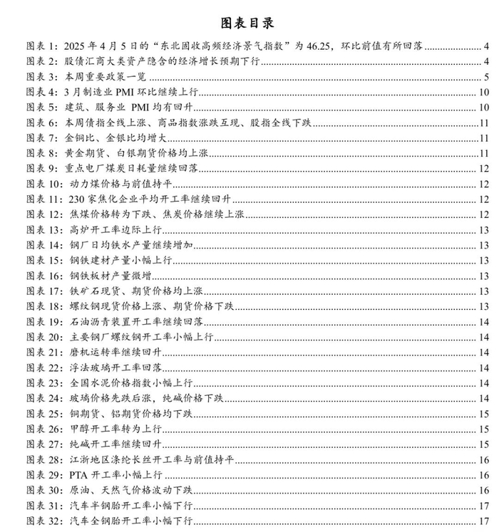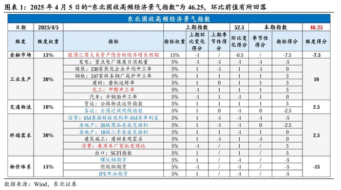 本周“东北固收高频经济景气指数”录得46.25,环比前值继续回落。本周在超预期关税政策影响下,各类权益资产与商品价格普遍回落。原油、螺纹钢等大宗商品价格下行对经济景气指数形成拖累。此外,票贴利率回落、商品房销售面积回落等因素亦构成经济景气指数回落的重要原因。