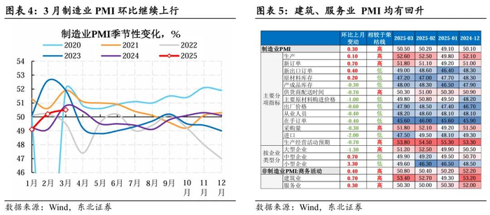 2025年3月制造业PMI指数为50.5%,环比上行0.3个百分点,整体符合预期。3月工作日充足,中旬以来企业复工复产基本到位,开工率持续修复,叠加政策环境宽松,供需两端协同增长,春旺特征较为明显,具体来看: