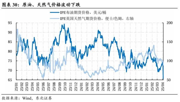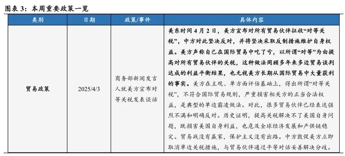 2)全球衰退预期及供给端等因素扰动下全球定价的大宗商品价格亦普遍下跌,布伦特原油价格跌至65.58美元/桶。从需求端看,加征关税引发市场对全球经济增长的担忧,导致原油等大宗商品需求预期下降,价格走低。从供应端看,关税政策可能影响全球制造业生产和投资,进而冲击工业金属需求,使其价格下跌。此外,据OPEC网站4月3日发布的声明,OPEC+组织同意在5月份向市场增加41.1万桶/日的石油供应,增幅是原计划的三倍,推动国际油价大幅暴跌,关注后续关注美国豁免清单调整以及OPEC+产量调整节奏。之前涨势较好的铜、铝等有色金属亦出现不同程度的下跌。