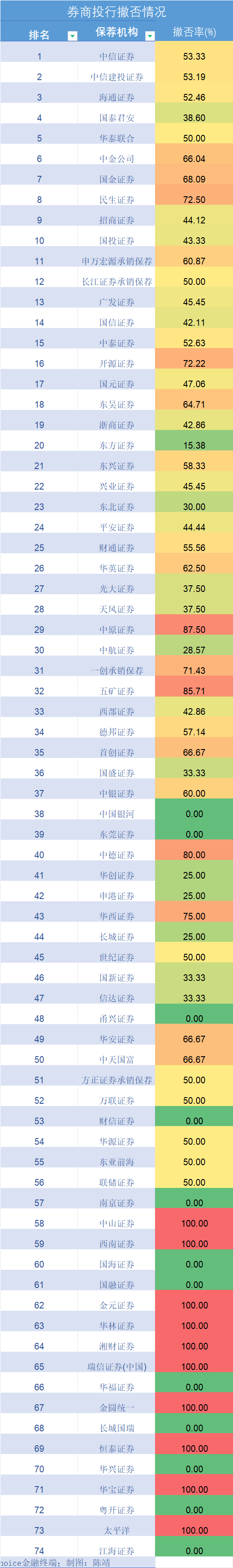 中山证券、西南证券(600369.SH)、金元证券、华林证券(002945.SZ)、湘财证券、瑞信证券(中国)、金圆统一、恒泰证券、华宝证券、太平洋撤否率为100%。