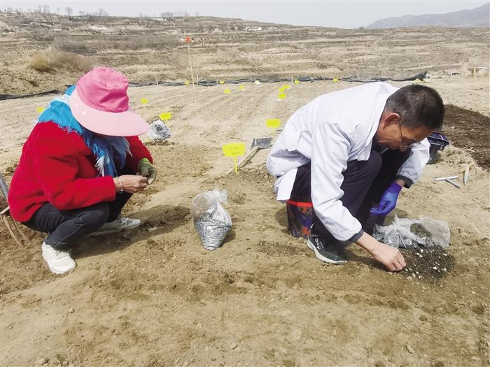 兰州市农研中心技术人员在榆中县百合基地大田定植试管苗。