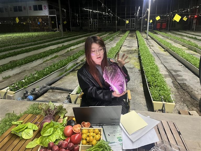 “欢迎大家来到迈绿达直播间,今天给大家介绍的这款好看又稀奇的菜品,俗称‘紫’白菜,可以鲜食,长在地里看起来像花儿一样,好看又好吃。”这是皋兰县迈绿达产业示范园新农人魏凯婷正在抖音直播的一幕。