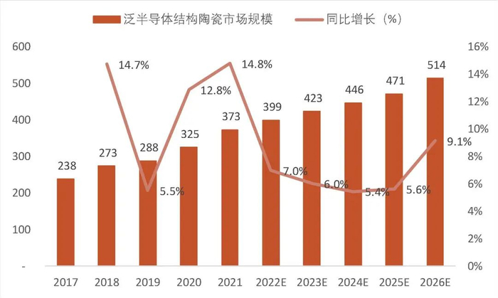 泛半导体领域是先进结构陶瓷的主要需求来源,预计2026年全球市场规模超500亿元
