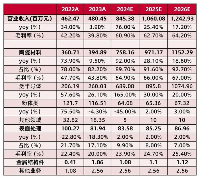 我们看好公司供应先进陶瓷结构件模组产品的稀缺性,及其在半导体设备领域陶瓷零部件的国产替代进程。2024年,公司为半导体晶圆厂和国内半导体主流设备厂商研发的多款陶瓷加热器产品量产;国内半导体设备及关键零部件国产化不断推进,公司来自用于半导体设备的陶瓷零部件收入大幅度增长;新投入研发的陶瓷材料氧化钛(导电陶瓷)和超高纯碳化硅(用于3代半导体)量产。综合来看,预计2024年公司泛半导体领域陶瓷材料同比增长165%。之后随着公司产能爬坡,规模效应逐步显现,预计25-26年陶瓷材料以相对稳健的增速保持增长。其他领域如表面处理服务和金属部件等其他领域在公司整体产品结构中的占比相对较小,随着下游显示面板行业需求逐步恢复,预计24-26年维持2%的小幅增长。预计公司2024-2026年分别实现营业收入8.45/10.60/12.43亿元,同比+75.96%/+25.40%/+17.25%;分别实现归母净利润3.11/4.31/5.26亿元,同比+279.46%/+38.60%/+22.09%。