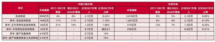 表5:先进陶瓷及细分领域境内外市场规模及公司份额情况(亿元,%)