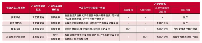 模块产品基本直接接触晶圆,在工艺环节中发挥关键功能。在半导体零部件中,与晶圆的距离亦可作为零部件重要性程度的一项参考标准。圆环圆筒类、气流导向类、承重固定类和手爪垫片类产品在腔室内外均有分布,其中部分与晶圆接触,发挥了支撑、传输、分隔以及协助工艺环境形成功能;模块产品基本处在工艺腔室内,并基本直接接触晶圆,在工艺环节形成中发挥关键功能。