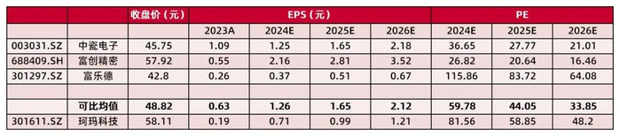 公司主营先进陶瓷材料零部件和泛半导体设备零部件表面处理服务,目前A股上市公司中尚无专门从事先进陶瓷材料零部件研发、生产和销售的企业,我们选取主营电子陶瓷系列产品的中瓷电子,泛半导体设备金属零部件制造的富创精密以及泛半导体设备表面处理服务的富乐德作为可比公司。预计公司2024-2026年EPS分别为0.71/0.99/1.21元,以4月1日收盘价58.11元计算,24-26年PE分别为81.56X/58.85X/48.20X。我们看好公司新品陶瓷结构件模组产品持续放量贡献的收入增量,在国产替代趋势下,公司在半导体先进结构陶瓷供应商中的市场份额持续稳固,首次覆盖给予“增持-A”评级。随着规模效应逐渐显现,公司估值水平向可比均值水平靠拢。