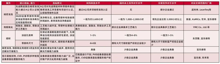 公司表面处理综合服务方案提供能力较强,已通过全球知名泛半导体设备厂商认证。在表面处理方面,公司具备较强的综合服务能力,具备对氧化铝、氮化铝、氧化钇等各基材先进陶瓷材料和金属材料等多种零部件的表面处理能力,且具备精密清洗、阳极氧化和熔射等多种工艺服务能力,并在熔射细分领域具备较强的市场竞争力。公司先进陶瓷新品的精密清洗已通过全球知名泛半导体设备厂商A公司的认证,将在显示面板领域继续推动与A公司在CVD设备表面处理服务合作;在对外表面处理服务方面,公司在洗净再生处理洁净度、熔射涂层品质和大尺寸零部件熔射等方面处于国内领先水平。