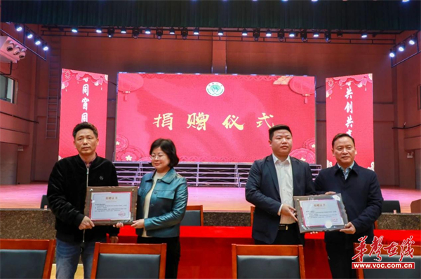 江西领宏科技有限公司总经理唐欢(其兄长系衡南一中校友)以实际行动表达了对一中的拳拳爱心,慷慨捐建衡南一中云集新校区高标准合唱教室一间(价值20万元)。校友唐忘为继去年向母校捐款100万元,此次郑重承诺自2024年起连续十年每年捐赠100万元,共计1000万元,用于学校拔尖创新人才培养的奖励基金,助力母校教育事业的发展。随后,双方签订了捐赠协议,万倩雯、刘华军为他们颁发了捐赠证书;佘焱为唐欢颁发了“名誉校友”证书。