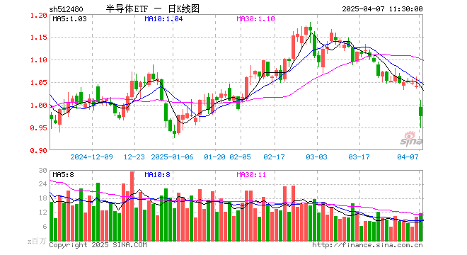 4月7日,截止午间收盘,半导体ETF(512480)跌6.44%,报0.974元,成交额11.59亿元。半导体ETF(512480)重仓股方面,中芯国际截止午盘跌3.97%,海光信息跌3.32%,寒武纪跌8.94%,北方华创涨0.40%,韦尔股份跌9.84%,中微公司跌3.55%,澜起科技跌9.72%,兆易创新跌7.74%,长电科技跌10.01%,紫光国微跌3.55%。