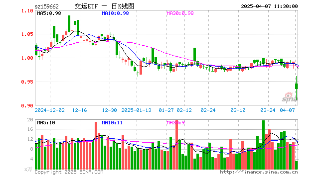 4月7日,截止午间收盘,交运ETF(159662)跌5.75%,报0.934元,成交额302.56万元。交运ETF(159662)重仓股方面,京沪高铁截止午盘跌3.33%,顺丰控股跌5.99%,中远海控跌9.75%,大秦铁路跌2.11%,上海机场跌5.44%,中国东航跌4.77%,中国国航跌3.89%,南方航空跌3.97%,招商公路跌1.31%,春秋航空跌3.48%。
