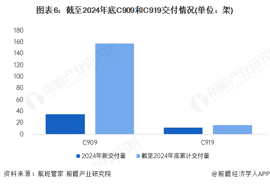 根据航班管家数据,截止2024年12月末,C909累计交付157架,C919累计交付16架。首架C919于2022年12月9日正式交付给中国东方航空,于2023年5月28日迎来商业首飞,开启常态化商业运营。