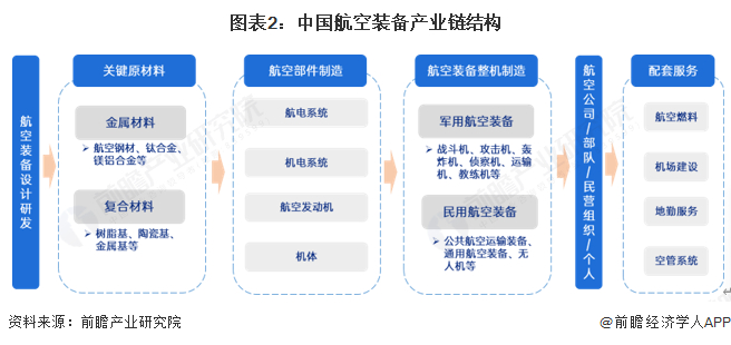 航空装备制造是航空装备产业链的关键环节,主要为航空部件制造和航空装备整机。其中航空部件制造可分为机体、发动机及机载设备三大部分。机体是航空装备结构的主要构成,发动机是航空装备的动力来源,机载设备是指对航空装备飞行中的各种信息、指令和操纵进行测量、处理、传递、显示和控制的设备。航空装备的细分市场大致为军用航空装备以及民用航空装备两大类。