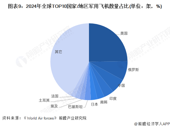 但与美俄等军事大国相比,我国的军用飞机总量仍有较大差距。截至2024年,美国军机总量占全球的24.8%,其次是俄罗斯占比8.2%、中国占比仅有6.3%。