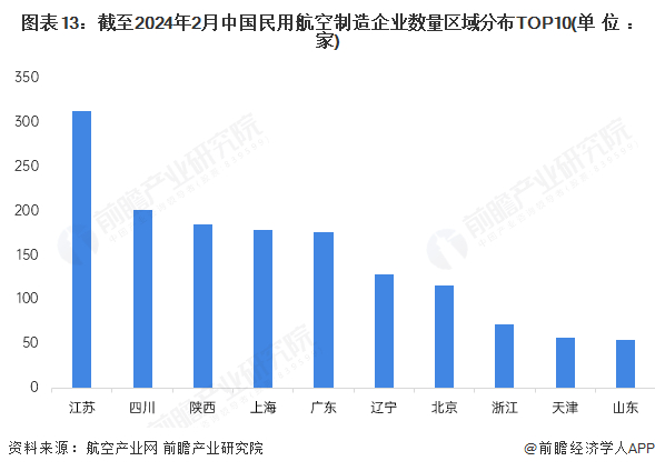 从我国民用航空制造企业的区域分布情况来看,目前,我国航空制造业竞争者主要分布在江苏、四川、陕西、上海等地,其中江苏企业数量最多。