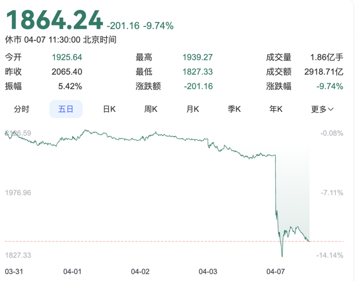 截至4月7日9点40分,创业板指跌幅扩大至9%以上,再度回落至 1900点下方;沪指下跌5.68%,深证成指下跌7.42%。沪深京三市近 3000只个股跌幅超过9%,全市场超5300只个股飘绿。与此同时,港股市场也未能幸免,恒生指数低开超9%,恒生科技指数低开 11.15%。截至发稿,恒生指数报20855点,跌幅8.73%;恒生科技指数报4776点,跌幅10.11%。