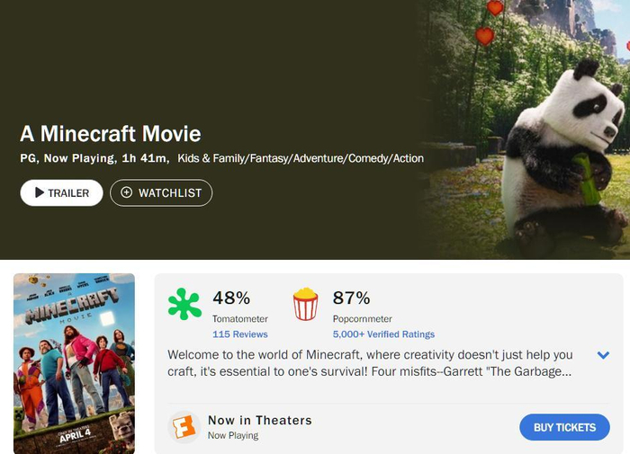 《我的世界大电影》“烂番茄”新鲜度是不及格的48%。