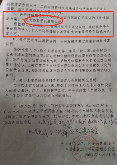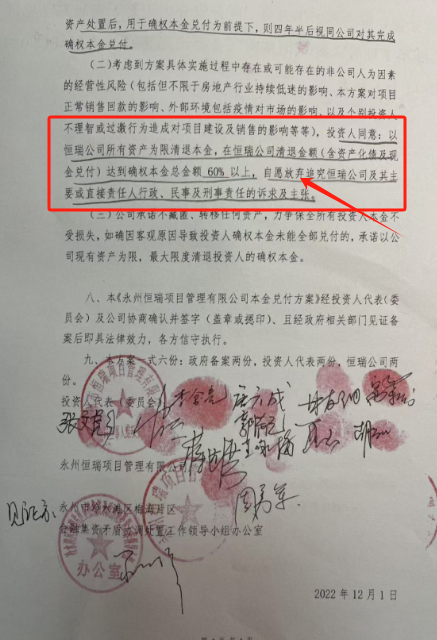 值得注意的是,方案中还“特别约定”:“考虑到方案具体实施过程中存在或可能存在非公司人为因素的经营风险,投资人同意:以恒瑞公司所有资产为限清退本金,在恒瑞公司清退金额达到确权本金总金额60%以上,自愿放弃追究恒瑞公司及其主要或直接责任人行政、民事及刑事责任的诉求及主张(如下图)。”