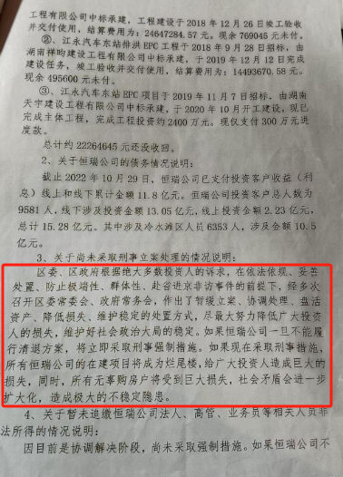 据投资人提供的一份冷水滩区政府回复的官方信访处理意见书显示,恒瑞公司自2014年2月25日成立以来,未经国务院金融管理部门依法许可,以许诺还本付息(月息1.3%~2.0%)给予投资回报为利诱,通过线上线下和虚假宣传等手段,向社会不特定人员吸收资金。截至2022年11月3日,吸收社会不特定人员9581人资金15.28亿元,其中冷水滩区6363人,涉及金额10.53亿元。