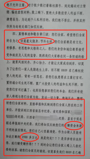 为此,章波瞒着家人,将家里所有的钱全部投到恒瑞公司所说的商业地产、股权投资、高科技、新能源等项目之中。甚至在恒瑞崩盘的前三天,唐国成还谎话连篇鼓动她投30万元购买了恒瑞公司兜底收益超过24%(月息2分)的银行资产包。