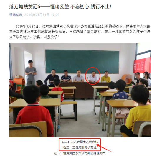 恒瑞的投资人告诉白鹿新闻,周勇军喜欢炫耀他与当地政府领导的关系“很铁”,甚至把与某些政要的合影照片放进公司的宣传页里来彰显支持恒瑞的发展,以及试图通过展现恒瑞公司的权力资源和实力。“其实,不少人连周勇军的面都没有见过,肯借钱的原因之一,是因为永州人都知道他和地方一些领导的关系非同一般,因此十分信赖,甚至还有人找关系请他接受投资款。”
