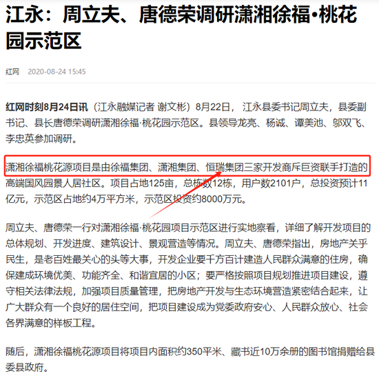 其间周勇军最大的手笔,则是房地产投资。从恒瑞公司的宣传页来看,他涉足18个房地产项目,其中包括永州桃花源、十里江湾、天普、永州大市场等项目。但白鹿新闻查询发现,这些项目大多跟他人合作开发,如潇湘徐福桃花源项目是由徐福集团、潇湘集团、恒瑞集团三家开发商斥巨资联手打造的高端国风园景人居社区(如下图)。投资人告诉白鹿新闻,这些地产项目,恒瑞公司只占有很小的比例股份,其参与开发的目的就是以此骗投资人加大投资力度,赢得民众的资金。