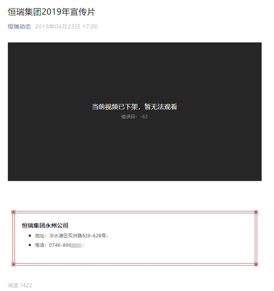 据当地投资人透露,恒瑞公司常采取类似的操作手法,也将另外三个政府工程项目作为恒瑞公司投资在建项目的信息发布在其官方网站、微信平台,其目的就是让投资者知道恒瑞公司有官方背景,且实力雄厚。但白鹿新闻注意到,自恒瑞官宣暴雷后,其官网、公众号“广州恒瑞财富”等均被注销,而有关恒瑞宣传片及当地政界领导出席公司活动等重要内容也全部下架(如下图)。不过,恒瑞公司早期的官方公众号“湖南财富恒瑞投资”及《恒瑞动态》还保留在,分别于2015年11月4日和2022年6月2日停止更新。