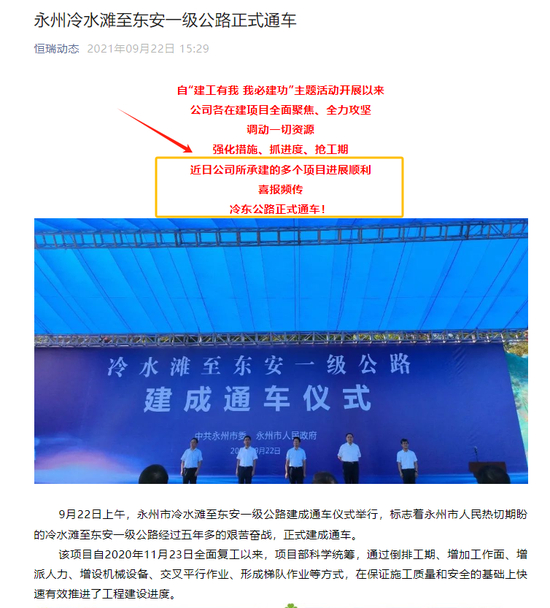 从以上政府项目的中标情况来看,恒瑞公司均没有参与,且无任何关联。但白鹿新闻在恒瑞公司公众号《恒瑞动态》中还能找到一篇有关《永州冷水滩至东安一级公路正式通车》的报道,文中提到“冷东一级公路是恒瑞公司所承建的多个市政项目之一”(如下图)。经查询,发现该报道内容基本转载当地永州新闻的报道,但经过《恒瑞动态》小编的加工,将原文中承建单位改为“恒瑞公司”。