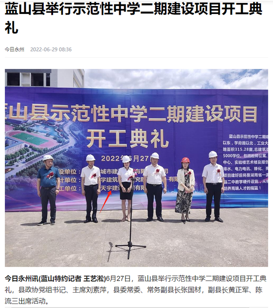 2022年6月29日,蓝山县政府官网刊发《蓝山县举行示范性中学二期建设项目开工典礼》消息称,6月27日,蓝山县举行示范性中学二期建设项目开工典礼,该项目是县委、县政府打造“教育强县”的重点项目,项目总投资3亿元。从这条消息中公布的现场背景照片来看,该工程项目的施工单位同江永汽车东站的施工单位都是同一家公司中标,即湖南省天宇建设工程有限公司(如下图)。而白鹿新闻从《永州市公共资源交易中心网》也查询到该项目中标单位确实为湖南省天宇建设工程有限公司。