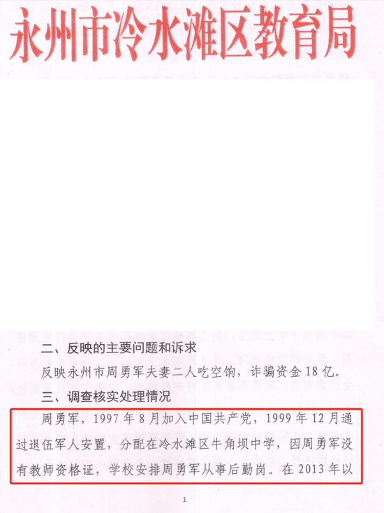 由于冷水滩区教育局一直不公开相关处理文件,很多人很难获取到周勇军“吃空饷”的准确时间。白鹿新闻在冷水滩区教育局采访时,各部门的相关人员相互推诿,均没有得到明确的答复。