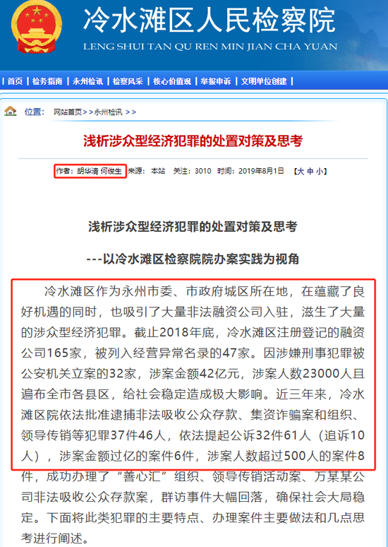 永州非法集资由来已久,时任冷水滩区检察院检察长胡华清2019年8月1日在区检察院官网发表的《浅析涉众型经济犯罪的处置对策及思考——以冷水滩区检察院办案实践为视角》署名文章指出了当地非法融资猖獗的惊人状况(如下图)。