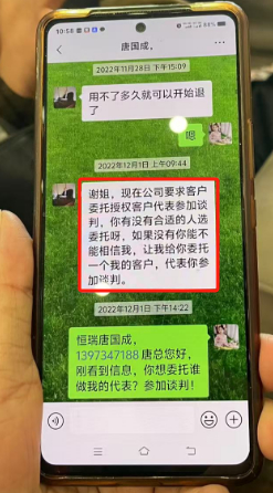 白鹿新闻掌握了一份业务员唐国成于2022年12月1日发给投资人谢姐的微信截图显示,唐国成说,“谢姐,现在公司要求客户委托客户代表参加谈判,你有没有合适的人选委托。如果没有你能相信我,让我给你委托一个我的客户,代表你参加(如下图)。”随后,唐国成给谢姐发了一个他指定的谈判代表。巧合的是,此代表正好出现在当天清退方案的投资人代表委员会签名中,而此人随后也在听证会的《会议纪要》中签了名。