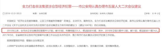 正是在这种尴尬的局面下,永州非法集资如星星之火,呈燎原之势。据2018年12月21日永州日报刊发的《全力打击非法集资涉众型经济犯罪——市公安局认真办理市五届人大二次会议建议》文章称,2015年以来,全市共立非法集资犯罪案件127起,破103起,刑事拘留231人,移送起诉93案(如下图)。