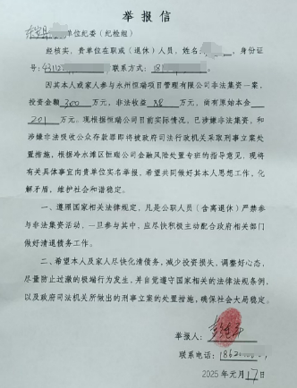 据冷水滩区政府通报,恒瑞公司涉嫌非法吸收公众存款等犯罪,已向9581名社会不特定人员筹集资金15.28亿元。白鹿新闻通过各渠道获悉,永州市已有上千名国家公职人员参与到恒瑞公司的集资,其中像张洪江一样被恒瑞公司举报、威胁的国家公职人员也不在少数。