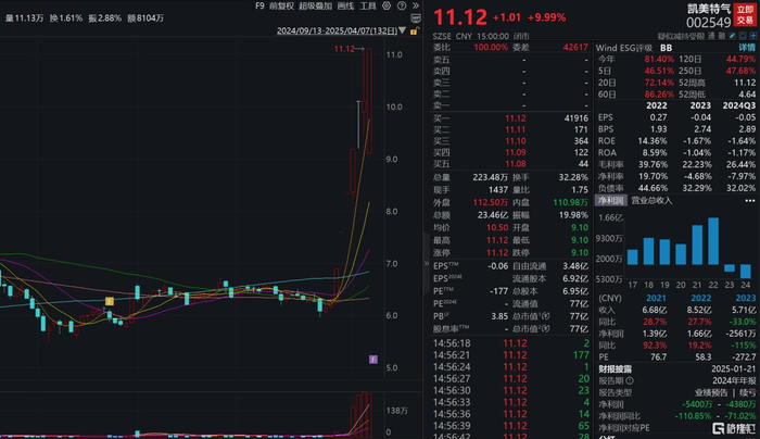 4月7日,当日开盘,凯美特气的股价快速跌停,但从9点36分开始打开跌停板,9点37分股价翻红,9点48分股价涨停,午盘后,几次炸板,截至发稿又回封,成功七天六板,目前股价报11.12元,总市值77.32亿元,市净率为3.85,市盈率(TTM)为-177.3倍。