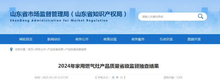 山东省市场监管局公布2024年家用燃气灶产品质量省级监督抽查结果