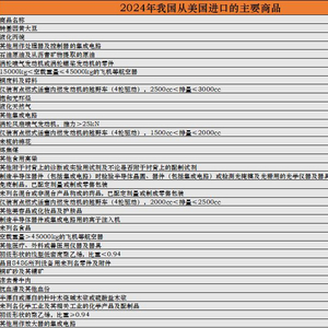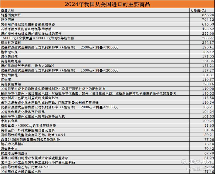 从中国对美进口产品列表来看,2024年,我国共从美国进口1.16万亿人民币,其中,进口金额在50亿以上的商品有35中,主要集中在农产品、能源、半导体及医药领域: