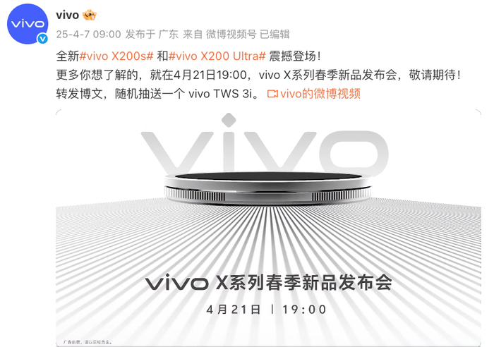 vivo X系列春季新品发布会将于4月21日19点举行,据了解届时将发布全新vivo X200s、新一代影像旗舰vivo X200 Ultra,还将带来vivo Pad5 Pro、vivo Pad SE、vivo WATCH 5等新品。