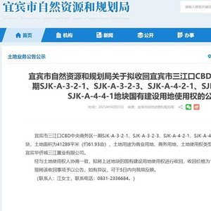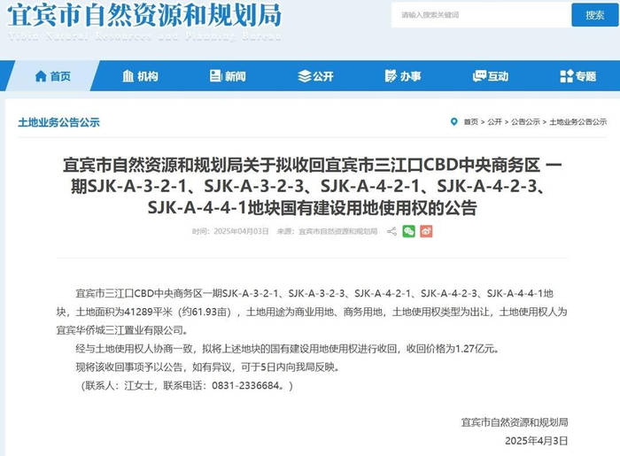 4月3日,宜宾市自然资源和规划局发布公告,拟收回三江口CBD中央商务区一期5宗地块国有建设用地使用权。收回地块总面约61.93亩,土地用途为商业用地、商务用地,使用权人为宜宾华侨城三江置业有限公司,收回价格为1.27亿元。