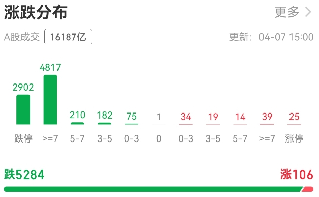 A股全天成交额约16187亿元,较前一日放量4600亿元。全市场下跌个股达5284只,其中2902只个股跌停,跌停数占市场总量超过半数;上涨个股仅106只,其中涨停个股25只。