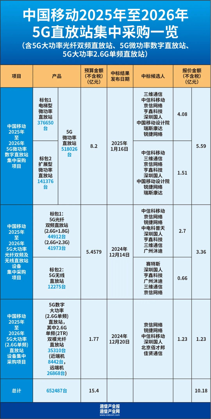 去年11月中国移动同时发布三则5G直放站集采,分别为2025年至2026年5G微功率数字直放站集中采购、5G大功率光纤双频及无线直放站设备集中采购和5G大功率(2.6G单频)直放站设备集中采购,三项设定最高投标金额分别为8.2亿元、5.4亿元和1.77亿元,5G直放站集采总预算约为15.4亿元(不含税)。直放站需求总量为652487台。