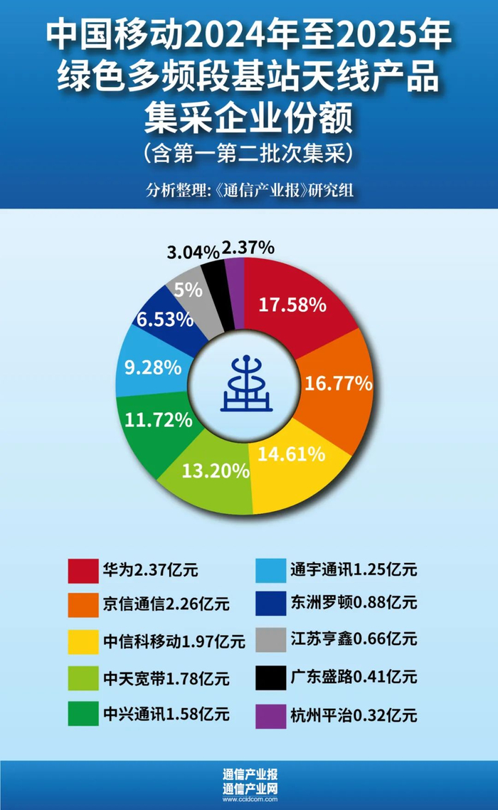 中国移动绿色多频段基站天线第二批次集采中标企业中,东洲罗顿和江苏亨鑫首次入选,广东盛路和杭州平治只中标了第一批次集采。据《通信产业报》全媒体记者测算,两次集采中最大赢家为华为中标总金额为2.37亿元,份额为17.58%,其次是京信通信总中标金额为2.26亿元,份额为16.77%,再次为中信科移动中标金额为1.97亿元,份额14.61%。