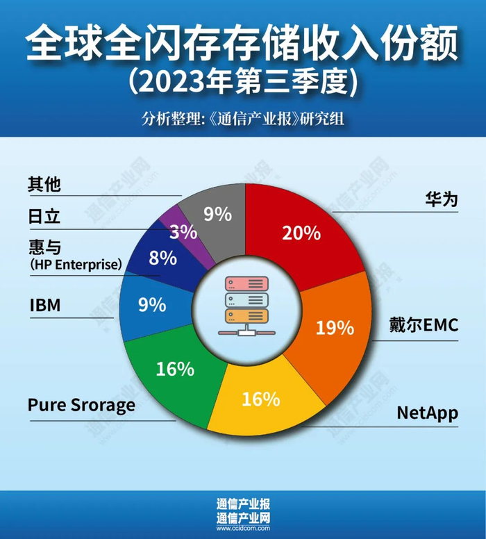 由多家变为华为独家中标,标志着华为在存储领域的江湖地位。早在2023年第三季度,华为首次超越戴尔EMC和NetApp,拿下全球季度全闪存市场份额第一,成为全球最大的商用全闪存存储产品生产商。