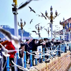 游客在青岛栈桥码头赏海鸥。董志刚摄/光明图片