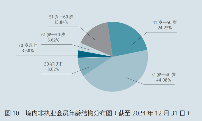 3.按非执业会员年龄统计。由于境外非执业会员年龄数据不全,故仅分析境内非执业会员年龄情况。截至2024年12月31日,年龄在31—40岁的境内非执业会员最多,共125094人,占44.08%;50岁以下非执业会员占比达76.94%(详见图10)。