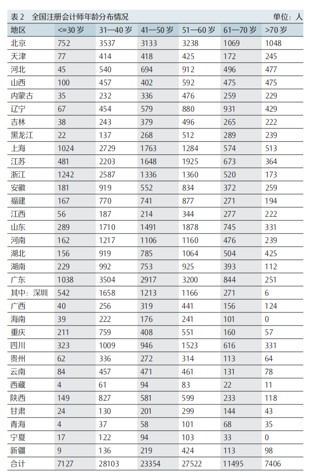 3.按年龄结构统计。截至2024年12月31日,30岁及以下的注册会计师共7127人,占6.79%;31—40岁的28103人,占26.76%;41—50岁的23354人,占22.24%;51—60岁的27522人,占26.21%;61—70岁的11495人,占10.95%;70岁以上的7406人,占7.05%。全国各地注册会计师年龄分布情况见表2。