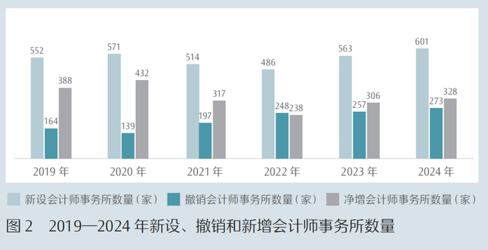 数据显示,2019—2024年会计师事务所总量稳步上升(详见图1),增长率于2021年出现下降,2022年达到低谷,2023年逐步回升。2019—2024年历年新设、撤销和净增会计师事务所数量详见图2。